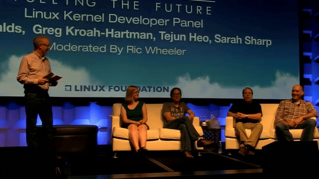 今年的LinuxCon大会于9月19日星期四在新奥尔良举办,Linux内核之父 Linus Torvalds 也出席了本次大会,他还作为Linux内核开发座谈小组的一员,回答了大量有关Linux发展的问题。座谈小组另外三人为 Tejun Heo、Sarah Sharp和Greg Kroah-HartMan 。座谈会由Ric Wheeler主持,他是红帽负责内核文件与储备团队的高级经理。