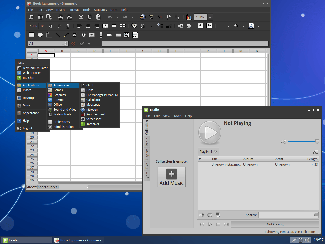 除了基本所需的文本编辑器、计算器、图像浏览、文件管理与档案管理外,Semplice Linux发行版还预装了很多有用的软件,例如Chromium浏览器、Claws Mail邮件客户端、XChat IRC以及Pidgin等聊天软件。另外,下载软件有gFTP和uGet,文档处理有GNU Paint、AbiWord、Gnumeric,娱乐播放有MPlayer、Exaile,刻录工具有xfburn,游戏子菜单下还有一个Tetris。