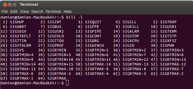当你执行一个"kill"命令,你实际上发送了一个信号给系统,让它去终结不正常的应用。总共有60个你可以使用的信号,但是基本上你只需要知道SIGTERM(15)和SIGKILL(9)。