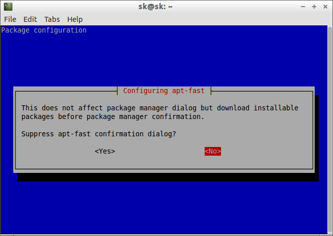 在下一个对话框里面,会问你是否要禁止apt-fast的确认对话框。选择No并继续安装。如果你选择Yes,apt-fast在安装软件包时不会问你确认与否。