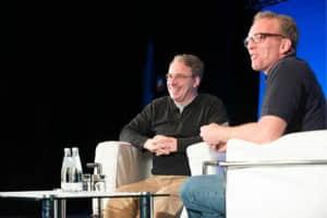 Linus Torvalds 和 Dirk Hohndel 在 Edinburgh举行的 LinuxCon Europe 大会主席台上