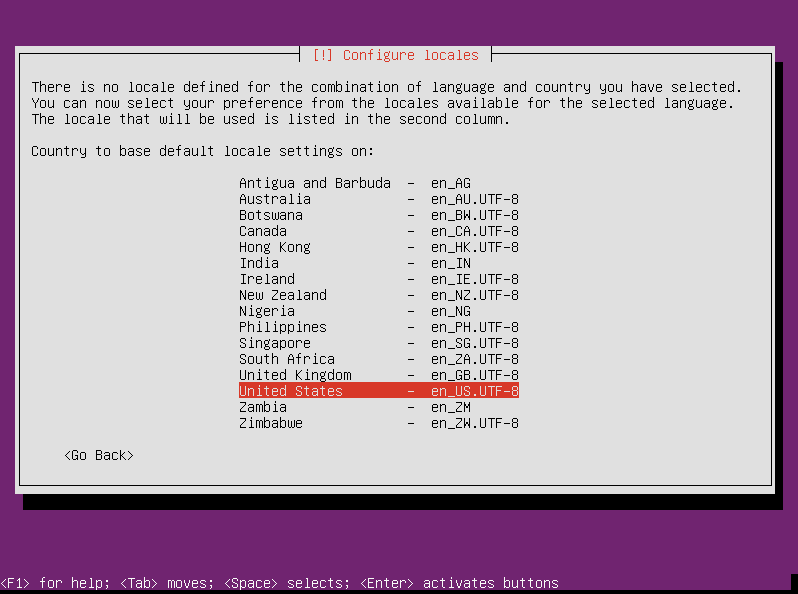 配置区域设置:(译注:对于服务器版本,我们建议一律采用英文的locale—— en_US.UTF-8,当然,你可以增加中文字体包,但是保持服务器环境是英文环境,有助于减少出现奇怪问题的几率。)