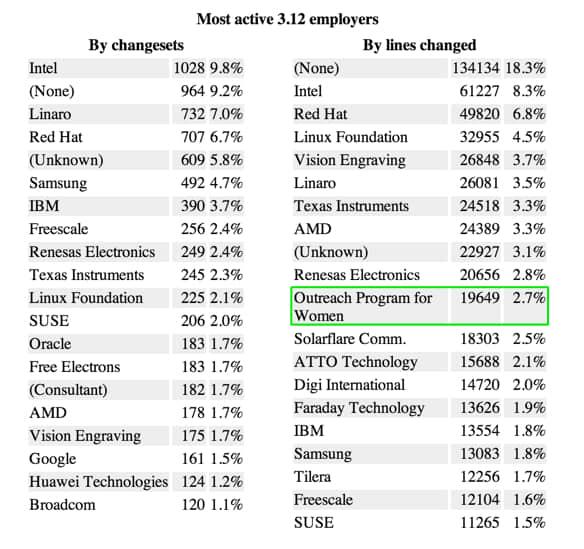 针对女性的招募项目在对Linux内核3.12的贡献已经名列前茅。来源:LWN.net