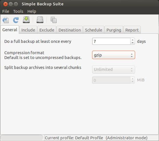 在 General 选项内,你可以选择多久进行一次完整备份,默认是7天。每7天 SBackup 将会进行一次完整的备份。你也可以选择备份的压缩格式。