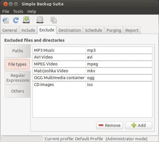 更进一步的是,你可以增加备份时排除文件的类型,像 mp3 和 avi 等等。在默认配置下,mp3, avi, mpeg, mkv, ogg 和 iso 是被排除不被备份的。如果你想备份这些文件,只要选中然后点击 remove。当然,如果要排除其他类型的文件,只需要点击 add 然后增加。