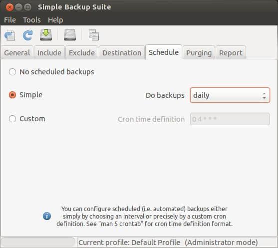 注意事项:如果你用普通用户运行 SBackup,计划任务备份不能生效,你需要用 root 用户来运行。如上图所示,因为我是以普通用户运行 Sbackup,所以 Schedule 选项是灰色不可选中状态。