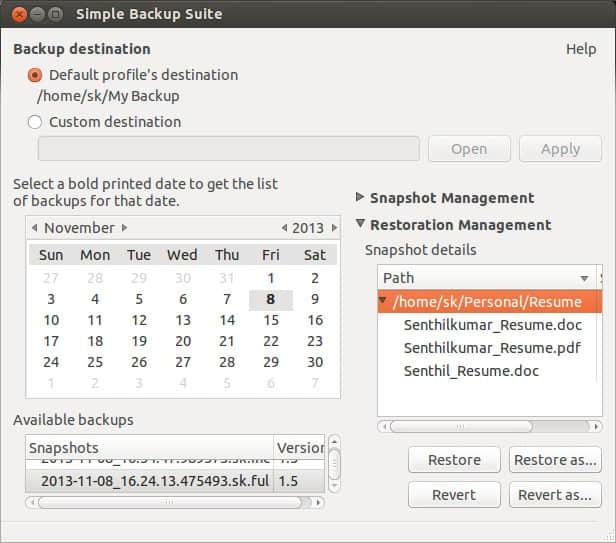 在 SBackup 的恢复窗口,选择可用的备份日期和快照,在 Restoration Management 面板中选择任意一个要恢复的文件,单击 restore 保存到默认位置或者单击 restore as 保存到指定的位置。