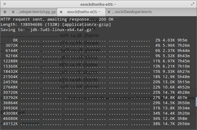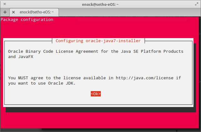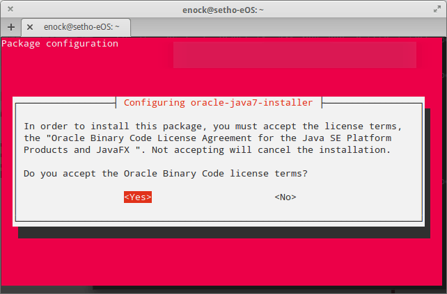 $ sudo apt-get install oracle-java7-installer [sudo] password for enock: Reading package lists... Done Building dependency tree Reading state information... Done The following packages were automatically installed and are no longer required: gir1.2-gstreamer-0.10 libilmbase6 libmagickcore4 libmagickwand4 libcdt4 libmagickcore4-extra liblqr-1-0 imagemagick-common libpathplan4 libopenexr6 rsync netpbm libgvc5 libnetpbm10 libgraph4 Use 'apt-get autoremove' to remove them. The following extra packages will be installed: gsfonts-x11 java-common Suggested packages: default-jre equivs binfmt-support visualvm ttf-baekmuk ttf-unfonts ttf-unfonts-core ttf-kochi-gothic ttf-sazanami-gothic ttf-kochi-mincho ttf-sazanami-mincho ttf-arphic-uming The following NEW packages will be installed: gsfonts-x11 java-common oracle-java7-installer 0 upgraded, 3 newly installed, 0 to remove and 196 not upgraded. Need to get 88.5 kB of archives. After this operation, 473 kB of additional disk space will be used. Do you want to continue [Y/n]?