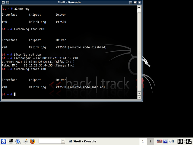 airmon-ng stop (interface) ifconfig (interface) down macchanger —mac 00:11:22:33:44:55 (interface) airmon-ng start (interface)