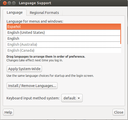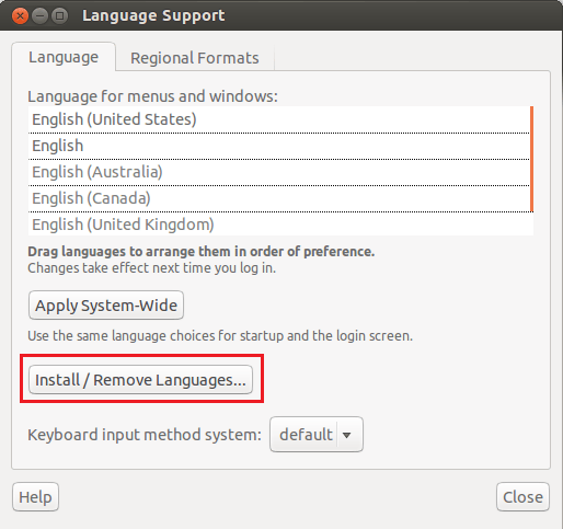 如果提示要你安装额外的语言支持,那就直接安装。如果没有,那么就单击 Install / Remove (安装/删除)去安装新的语言包,然后,选择你想安装的语言来安装。最后,拖动新的语言到列表的顶端并且保存。这些更改只会应用在你的个人帐号上。如果你想应用在全局范围内,单击 Apply System-Wide(应用到全局设置) 。