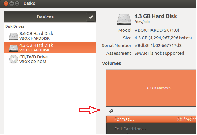 插入磁盘后,进入Unity Dash 并搜索Disks。打开它并选择你希望适用的外部驱动器,点击 Tools –> Format