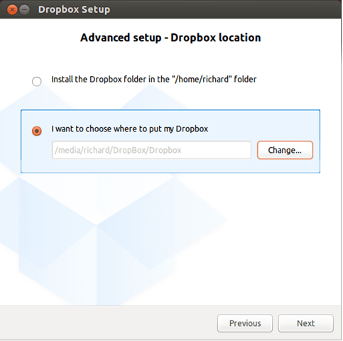 当提示选择安装类型,选择‘Advanced’并指定位置安装Dropbox文件夹。