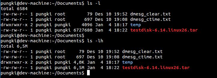 以字节为单位看大小可能会不方便。6.5M读起来比6727680字节更简单。要这么做,我们可以使用-h与-l结合的参数。-h参数意味着便于人识别。