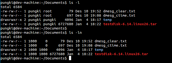 如果你想以数字方式列出项的所有者和所有组(即UID和GID),我们可以带-n选项使用ls命令。这里是个例子。