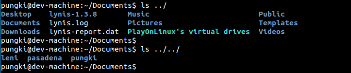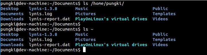 要列出你的主目录,你可以用"~"(波浪号)来代表它。这样你就不必输入完整的目录名。让我们假设家文件名为/home/pungki,那么波浪号就对/home/pungki有意义了。