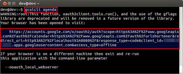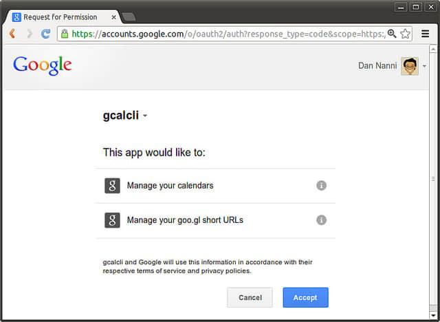 为了能让 gcalcli 访问 Google Calendar ,你需要用你的 Google 帐号通过 OAuth2 认证,以使 gcalcli 获得许可来访问你的 Google Calendar。