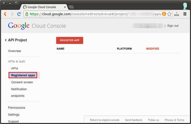 现在转到“APIs & auth”下的“Registered apps”那里,去注册 gcalcli app。点击最顶端的“Registered app”按钮。