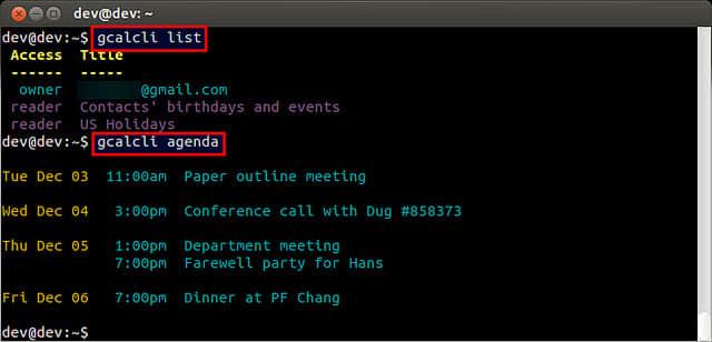 试试下面的命令,这两个命令会分别打印出一个你的 Google Calendar 的列表和今后 5 天的日程安排。