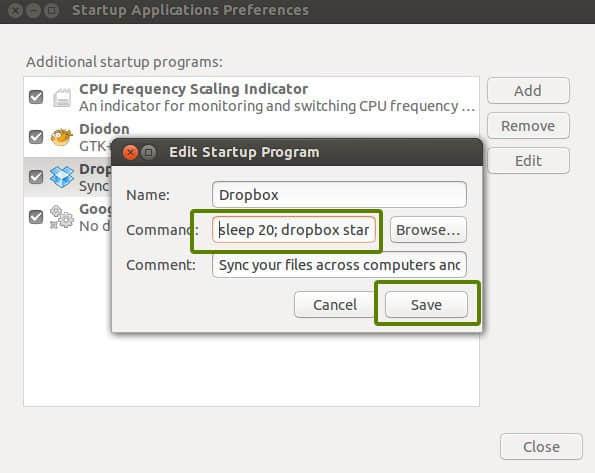 这样,命令‘dropbox start -i‘变成了‘sleep 20; dropbox start -i‘。这就意味着Dropbox的启动会有20秒延迟。你可以像这样为其他开机启动的应用程序设置一个等待时间。