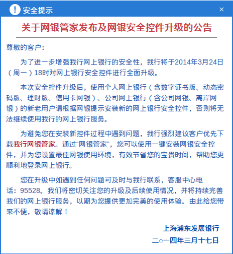 多年以来,浦发银行的个人网银,由于其良好的兼容性,而备受好评。浦发银行也曾在网上银行兼容性列表上处于“当仁不让”的地位,并获得“三年化碧”的殊荣,一直都是众多非 Windows 平台用户的首选。(当然,现在由于苹果用户和非IE内核浏览器用户越来越多,已经有不少银行也改善了其网银的兼容性,但兼容 Linux 系统的网银仍然屈指可数。)而现在,浦发银行一下子跌落到了“自郐以下”了。我当年也是因为浦发网银兼容 Linux 系统,才特意开的浦发银行的账户。但是,此次升级后,我却无法像以前那样正常登录网银了,看着网页上的“暂不支持此系统”,不知所措。而我事先没有收到任何相关通知!我个人觉得,这至少已经是浦发银行对用户的一种不尊重了!