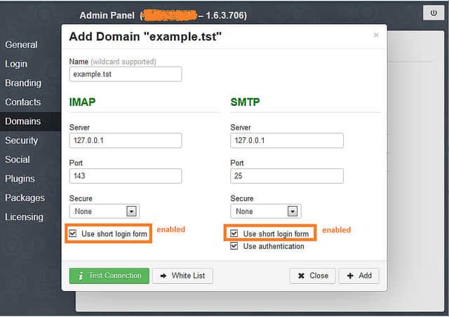 在 管理面板> 域> 增加域 页面设置有效的域。建议服务器 IP 是本地服务器,如 127.0.0.1。基于服务器配置,RainLoop 可以配置使用 IMAP/IMAPS 或 SMTP/SMTPS。并且,确认‘使用短登录表单’复选框已勾选。