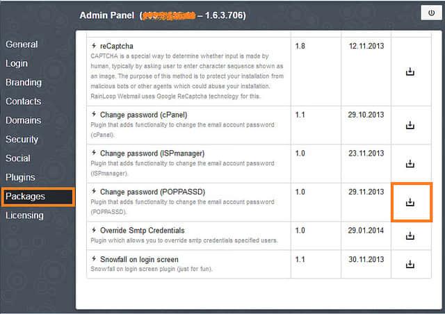 接下来,去允许 RainLoop 使用 poppassd,从 管理面板> 软件包 页面安装 RainLoop 插件 poppassd。