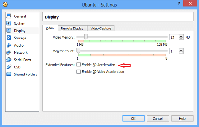 现在你必须在Ubuntu的虚拟机中设置关闭3D加速才能让截屏正常工作。现在打开一个虚拟机尝试来截个屏幕吧。