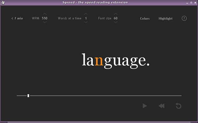 基于Perl和GTK2,spread0r(曾名为Gritz)是一个GPL软件,它以文本文档作为输入,然后将文本内容在你眼前以最高1000词每分钟速度闪过。当然你可以先尝试较慢的速度,来慢慢熟悉它。软件的用户界面十分简介,功能按键几乎极简:开始文章阅读,选择阅读速度,推出等等。这个软件也有一些需要改进的地方,我建议使其能够支持除了文本文档之外的其他文件作为输入(当然你也可以自己转换格式),另外也可以考虑加入“无干扰”模式。不管怎样,这款软件是十分高大上的。