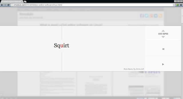 如果您喜欢在浏览器中快速阅读的点子,但是你不使用Chrome,也不喜欢“扩展程序”,对此的解决方案是书签Squirt。除了Squirt这个不明觉厉的名字之外,Squirt是我现在最喜欢的快速阅读工具。它十分高效并且使用简单。从这里加入它,通过把那个蓝色大按钮拖进你最喜欢的书签栏中。然后你就可以在任何网页中打开它,无论是否选中了阅读文本——一个白色的面板会出现在当前页面之上。你可以凭直觉来控制阅读文本。用户界面十分漂亮,而且它也可以实现4,000词以上的阅读速度。
