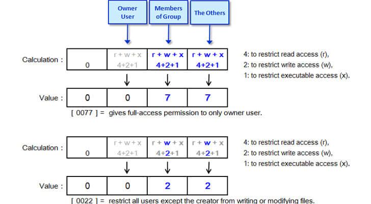 上面的意思可以解释成任何基于 Linux 的操作系统为新建文件(包括文件夹)添加默认权限的规则。出于教育目的,下面列出了一些可以用来设置文件权限的八进制值掩码: