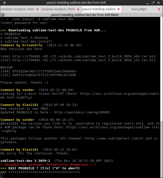 loading packages... resolving dependencies... looking for inter-conflicts... Packages (1): sublime-text-dev-3.3059-1 Total Installed Size: 16.02 MiB :: Proceed with installation? [Y/n] y (1/1) checking keys in keyring [########################################] 100% (1/1) checking package integrity [########################################] 100% (1/1) loading package files [########################################] 100% (1/1) checking for file conflicts [########################################] 100% (1/1) checking available disk space [########################################] 100% (1/1) installing sublime-text-dev [########################################] 100% ------------------------------------------------------------------------------ ==> sublime-text-dev install/upgrade note: ------------------------------------------------------------------------------ To disable in-application reminders about new Sublime Text dev versions, add the following setting to your User Preferences file: "update_check": false ------------------------------------------------------------------