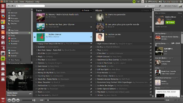 这样就安装完成了。现在可以在Unity Dash (ubuntu 中) 上通过搜索Spotify 来启动它。在 Ubuntu 环境下,Spotify 客户端整合的非常好。这是 Spotify 在 Ubuntu 14.04 下的界面: