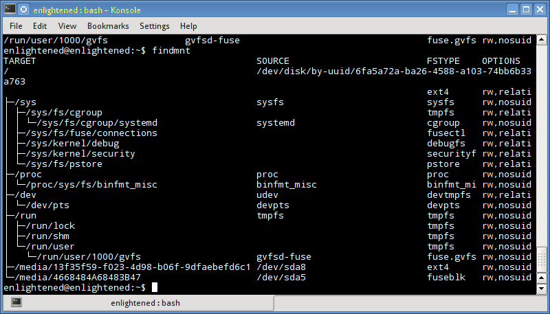 $ findmnt -l TARGET SOURCE FSTYPE OPTIONS /sys sysfs sysfs rw,nosu /proc proc proc rw,nosu /dev udev devtmpf rw,rela /dev/pts devpts devpts rw,nosu /run tmpfs tmpfs rw,nosu / /dev/disk/by-uuid/6fa5a72a-ba26-4588-a103-74bb6b33a763 ext4 rw,rela /sys/fs/cgroup tmpfs rw,rela /sys/fs/fuse/connections fusectl rw,rela /sys/kernel/debug debugfs rw,rela /sys/kernel/security securit rw,rela /run/lock tmpfs rw,nosu /run/shm tmpfs rw,nosu /run/user tmpfs rw,nosu /sys/fs/pstore pstore rw,rela /media/13f35f59-f023-4d98-b06f-9dfaebefd6c1 /dev/sda8 ext4 rw,nosu /media/4668484A68483B47 /dev/sda5 fuseblk rw,nosu /proc/sys/fs/binfmt_misc binfmt_misc binfmt_ rw,nosu /sys/fs/cgroup/systemd systemd cgroup rw,nosu /run/user/1000/gvfs gvfsd-fuse fuse.gv rw,nosu