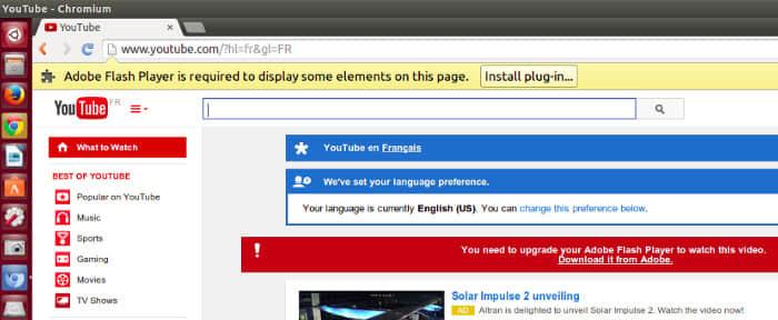 其实这不是因为Chromium是在Ubuntu 14.04上使用才出现的问题。当你用其他的网页浏览器比如火狐、Chrome时,你可以轻松地播放You Tube等网站视频,但在Chromium中你将会看到Adobe Flash player缺失插件的通知: