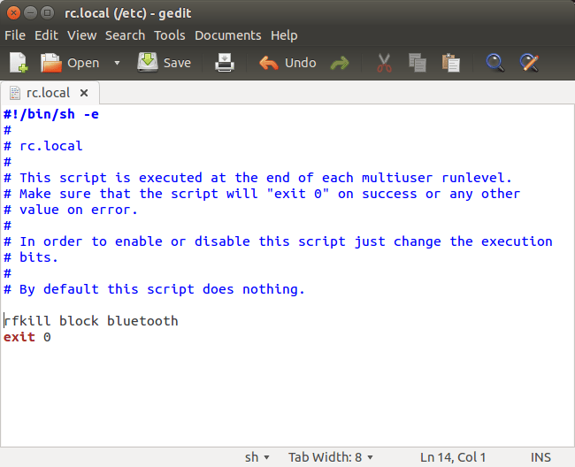 rc.local文件是用来记录在系统启动的时候运行的各种shell命令的。这些命令是用户定义的。在一个新的安装中,rc.local文件中没有任何命令。我们做的就是在这里面加入命令 rfkill block bluetooth。rfkill是一个用来查询各种开关,按钮和底层系统接口状态的工具。我们在rc.local中使用这个命令来在每次启动的时候软关闭(译注:与其对应的是硬关闭,指通过硬件开关来关闭)蓝牙。我希望这些能把原理解释的清楚一点。