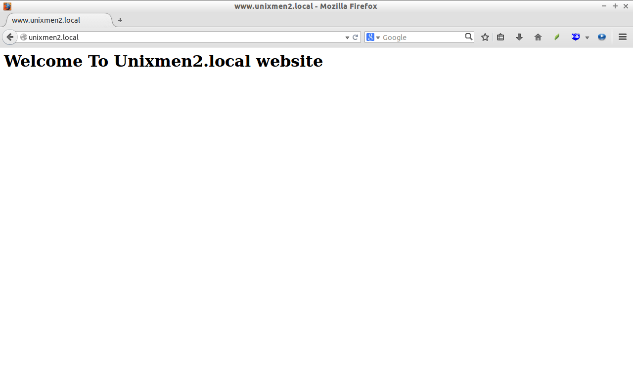 <html> <head> <title>www.unixmen2.local</title> </head> <body> <h1>Welcome To Unixmen2.local website</h1> </body> </html>