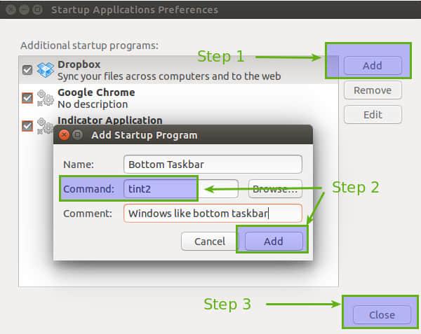 打开启动程序,在那儿猛戳添加按钮,你就可以添加一个新的开机启动程序了。你可以给它起个好认的名字,那命令那栏输入tint2,然后猛戳添加,然后继续猛戳关闭来保存。如果我说得不够清楚,还是看看下面的图片吧,它应该很直观了:
