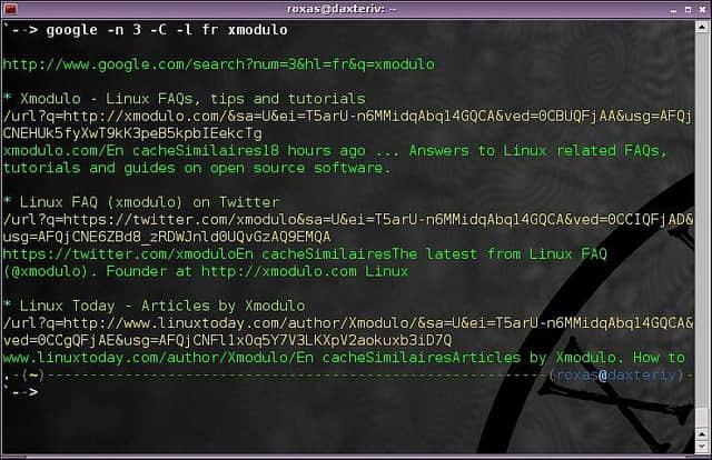 它会打开网页浏览器,并转到合适的搜索页面。然而,如果你想要的是从终端窗口查看搜索结果,而不是打开什么网页浏览器,那么我推荐你使用cli-google。它是一个超级老古董了(最后一次更新是在2009年),但我喜欢它。这是一个简单而直接的应用,它会忠实地干好它应该干的事。