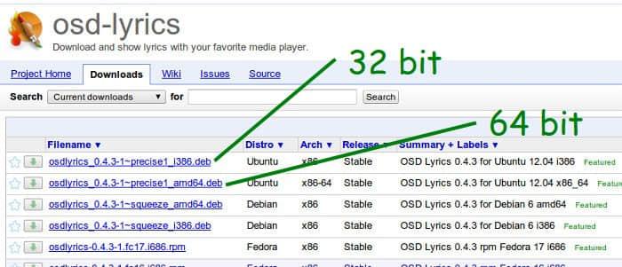 前往下载页下载OSDLyrics,根据你是使用32位还是64位的ubuntu来下载相应的.deb 文件。你会在网页的上方找到这些文件。