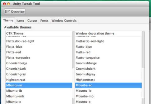 现在打开刚才安装的工具来选择主题,在GTK主题上选择MBuntu。再本地tab上选择Mbuntu-osx在光标tab上选择Mac-cursors.
