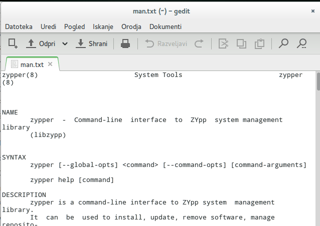 这儿我所干的是, 我想要获得zypper的一个帮助页。但是,我想要把它放到一个文本文件中去,因而我可以在我需要他们的时候(例如,在论坛、IRC寻求帮助时)很方便地读取这些结果。所以,这个命令做的是,保存man zypper输出结果到我的家目录中的man.txt,这样你可以看到,我可以用gedit来打开它: