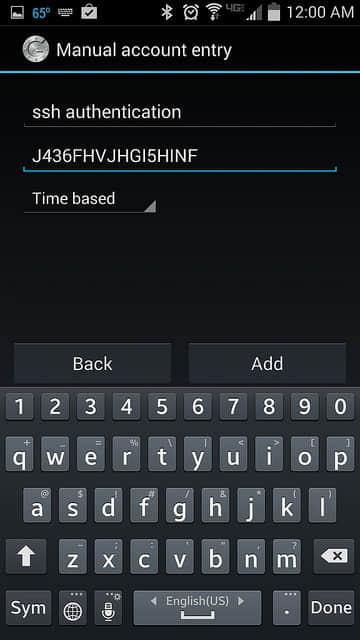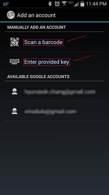 你可以选择“Scan a barcode” 或者“Enter provided key”选项。“Scan a barcode”允许你扫描二维码来完成密钥的输入,在此可能需要先安装扫描软件 Barcode Scanner 应用。如果选择“Enter provided key”选项,你可以使用键盘输入验证密钥,如下图所示: