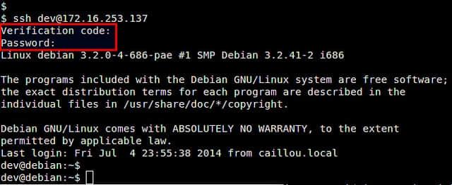 当提示你输入验证码的时候,输入我们刚获得的验证码。验证成功后,再输入 SSH 的登录密码。