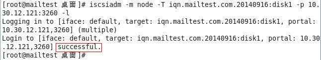 #iscsiadm -m node -T iqn.mailtest.com.20140916:disk1 -p 10.30.12.121:3260 -l(效果看下图)