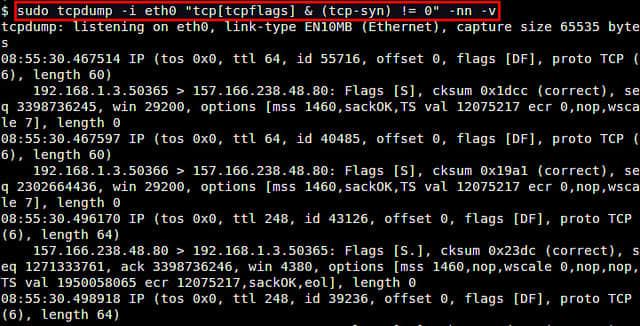 # tcpdump -r <interface> "tcp[tcpflags] & (tcp-syn|tcp-ack) != 0"