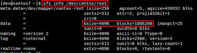 作为目标XFS文件系统来扩展,你可以指定挂载点、磁盘分区或者逻辑卷(在使用LVM时),使用数据块数量来指定新的XFS文件系统的大小。你可以使用xfs_info命令行工具来检查数据块大小和数量: