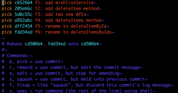 该文件为您提供一些rebase选择,它带有一个提示(蓝色文字)。对于每一个提交,我们可以选择的动作有pick、rwork、edit、squash、fixup和exec。每一个动作也可以通过它的缩写形式p、r、e、s、f和e引用。描述每一个选项超出了本文范畴,所以让我们专注于我们的具体任务。