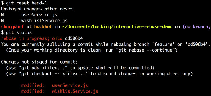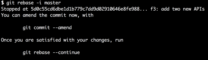 现在我们保存文件(在Vim中是按下后输入:wq,最后是按下回车)。接下来我们注意到git在编辑选项中选择的提交处停止了rebase。