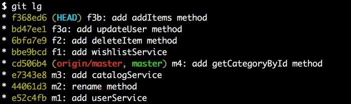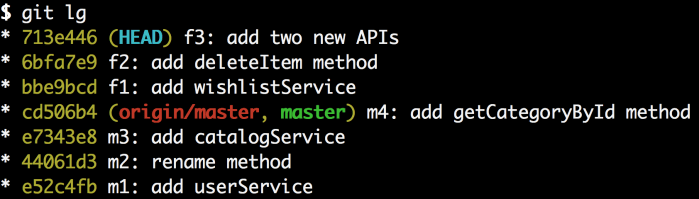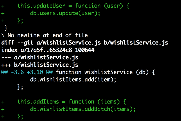 太棒了!让我们为wishlistService.js的改变创建另外一个提交。运行git add wishlistService.js,接着运行git commit -m "f3b: add addItems method".